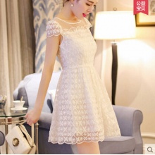 • 商品名称:荷叶边欧根纱刺绣短袖镂空蕾丝连衣裙 夏韩系小香风短裙A字连衣裙